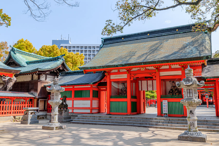 Sumiyoshi Shrine in central Hakata, Fukuoka, honors sea voyage guardians. It blends solemnity with urban convenience, attracting international couples.
